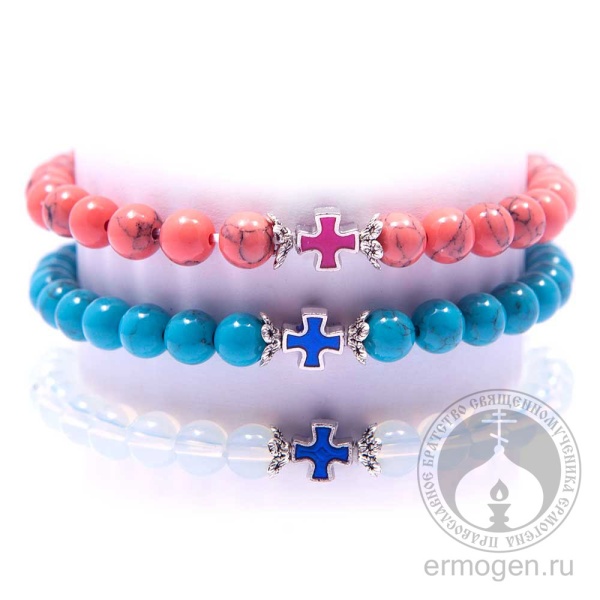 Женский браслет из агата и кварца с цветным эмалированным крестиком представлен в нескольких цветах. Наличие резинки делает ношение украшения удобным. Браслет может использоваться в качестве каменных чёток на тридцать зёрен.