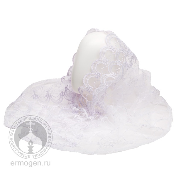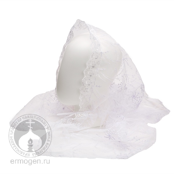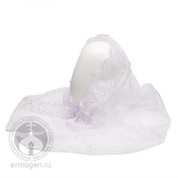 Белый ниспадающий платок выполнен из качественного кружева. Головной убор очень удобен для посещения храма. Благодаря специальному крою изделие не спадает с головы, а складки ткани полностью покрывают грудь и плечи, что особенно актально при посещении церковной службы летом. Нежное кружево придаёт образу нежность, лёгкость и воздушность.