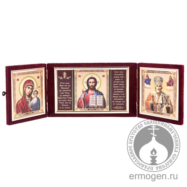 Тройной складень состоит из традиционных икон: Спасителя, Пресвятой Богородицы «Казанская» и святителя Николая Чудотворца. В центральной части, рядом с образом Господа, содержатся слова главной христианской молитвы «Отче наш». Корпус складня обтянут бархатом.