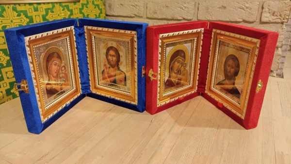 Святые лики, изображенные на иконе, естественные, цвета не искажены, тонкие детали четкие. Икона в золотистой деревянной рамне, под стеклом. Бархатный складень синего или красного цвета из мягкого плотного бархата с поролоновой прокладкой, который придает ему объем. Размер икон 100*120 мм. Иконы вынимаются из киота с помощью язычков [ленточек из плотного шелка по цвету киота].Защелка киота из сплава желтого цвета, который не окисляется.
