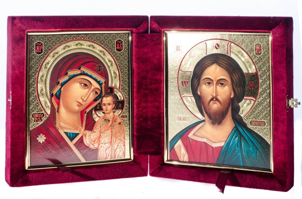 Складень [ венчальная пара икон] с ликами Господа Иисуса Христа Вседержителя и иконой Казанской Божией Матери. Иконы выполнена методом комбинированной печати с золочением и фигурным «обратным» тинением [декоративные детали иконы имеют объем]. Лики расположены на темнозеленом фоне, вокруг основного изображения - лики Пресвятой Богородицы, святых, вверху над ликом - Святая Троица, внизу - наименование иконы на церковно-славянском языке. Слева и справа золотом написаная краткая молитва.