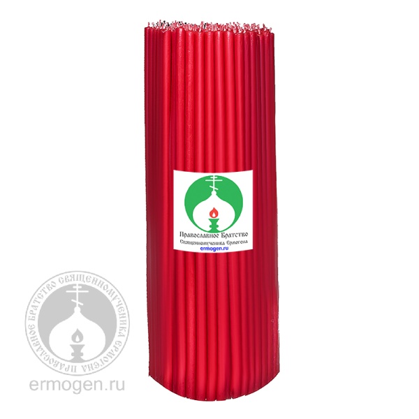 Возжигание красных свечей в храме связано с периодом величайшего праздника православных – Пасхи Христовой. Красный цвет, согласно цветовой символике Церкви, означает в данном случае красоту и радость Праздника Воскресения Христова, силу Его Божественной победы над злом и смертью. Пасхальные свечи традиционно используются верующими от Пасхи до Вознесения, однако, не возбраняется зажигать их и в другие дни, например, в воскресенье, во время молитвы. Православное Братство священномученика Ермогена производит качественные пасхальные свечи, выполненные с учетом всех технологических требований безопасности для здоровья – продукция имеет сертификат Ростеста, соответствует Уставу РПЦ. Состав сырья соответствует ГОСТу, включает натуральный пчелиный воск, пищевой парафин марки «П-2», 100% х/б фитиль, специально подобранный под каждый номер свечи.