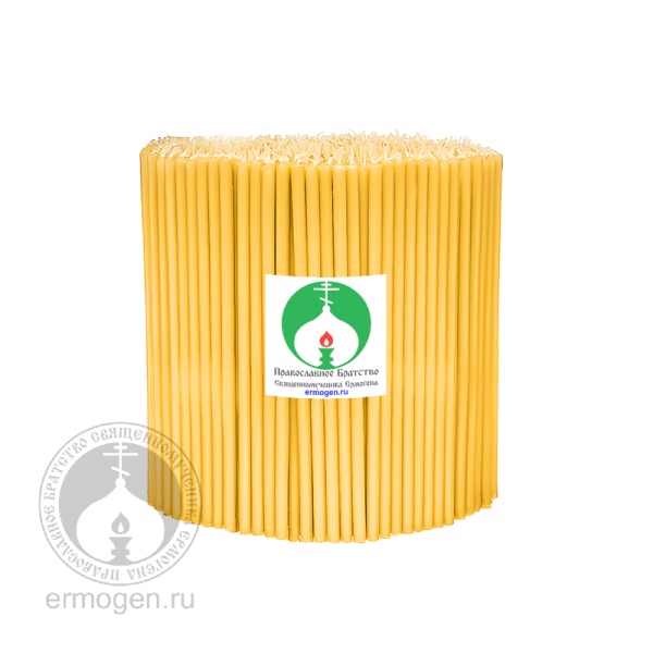 Братство священномученика Ермогена предлагает богослужебные полувосковые свечи собственного производства. Состав сырья соответствует ГОСТу, включает натуральный пчелиный воск, пищевой парафин марки «П-2», 100% х/б фитиль, специально подобранный под каждый номер свечи. По сравнению с восковыми аналогами, наши свечи имеют более высокую температуру плавления, что позволяет значительно сократить количество копоти и «слёз». Добавление стеарина стабилизирует горение свечи на сквозняке и жарком помещении. Полувосковые свечи обладают приятным характерным ароматом, не трещат и не выделяют вредных веществ. Вся продукция изготовлена в соответствии с Уставом РПЦ, имеет сертификат Ростеста.