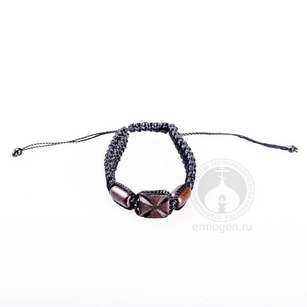 Чёрный браслет выполнен из текстиля, в центре украшения - квадратный самшитовый крестик.С помощью шнурков можно отрегулировать размер браслета. Молитва «90 пслаом» на изделии защищает верующего от всякого зла и опасности.