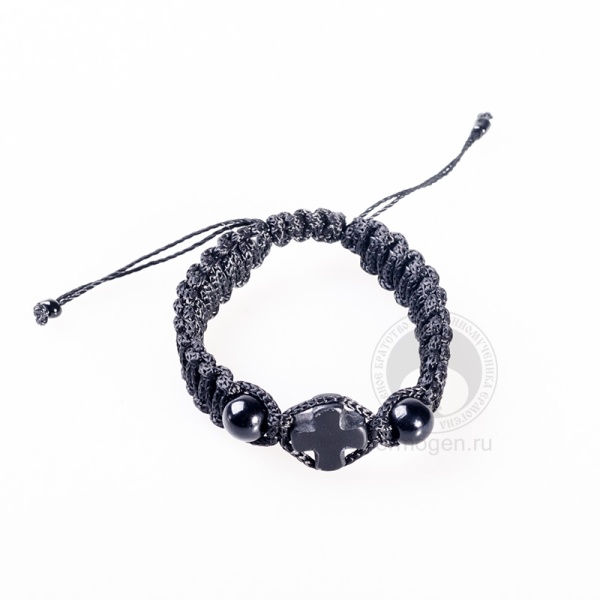 Плетёный браслет чёрного цвета изготовлен из текстильной тесьмы. В центре - крестик с полоской из агата. «90 псалом» защищает верущего от внезапной смерти и опасности.