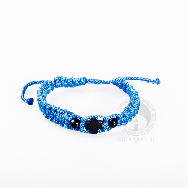 Плетёный детский браслет сделан из голубой текстильной тесьмы со вставкой-крестиком. Размер регулируется затяжкой-шнурком. На браслете содержится «90 псалом» - православная молитва, сохраняющая в опасности.