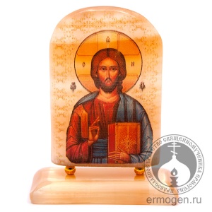 Икона «Господь Вседержитель» является основополагающей в иконографии Христа. Достаточно часто Сын Божий изображается на иконе «оплечно», т.е. по пояс. Правая рука Христа сложена в благословляющем жесте. В левой руке Он держит книгу – Евангелие. Икона на подставке «Иисус Господь Вседержитель» изготовлена из селенита. Этот материал представляет собой разновидность гипса и внешне очень похож на лунный камень. Для него характерно необычное внутреннее сияние с нежными переливами при повороте.