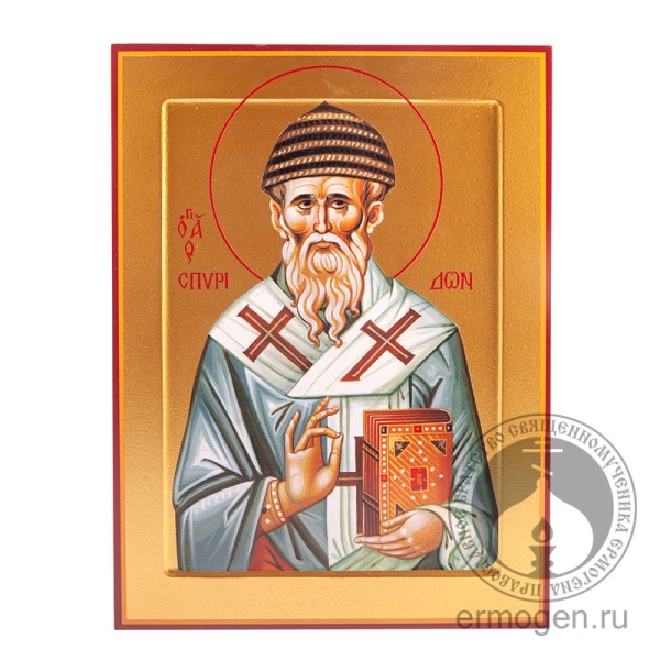 Спиридон Тримифунтский – великий святой христианской Церкви, чудотворец, почитаемый наравне со святителем Николаем Мирликийским. Родился на острове Кипр в конце III века, имел простое происхождение и был пастухом. Отличался богоугодной жизнью, добротой, отзывчивость и сострадательностью к людям. В годы царствования Константина великого Спиридон был избран епископом Тримифунта. По преданию, святым совершено множество необычайных чудес, таких как: прекращение засухи, исцеление неизлечимых больных, воскрешение умерших. Чудеса помощи святителя Спиридона продолжают совершаться и по сей день. Святителю молятся об обретении жилища, о защите при несправедливости, об исцелении от болезней, об обретении истинной веры. Икона Спиридона Тримифунтского выполнена на дереве с покрытием сусальным золотом.