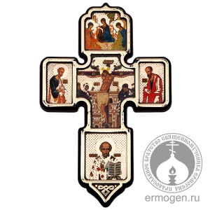 Крест с распятием Иисуса Христа прямоугольный с фигурной рамкой с четырьмя святыми ликами. Материалы – пластик, позолота. Особенность креста – распятие в центральной части. Длина изделия 10,5 см, высота 15 см. Крепление на двухстороннем скотче. Рассмотреть подробнее изделие можно на фотографии.