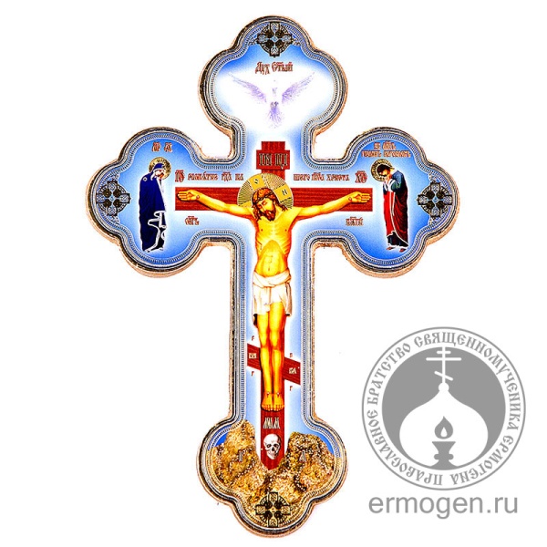 Крест с распятием настенный выполнен в голубых Богородичных тонах методом нанесения полиграфического изображения на дерево. Данный метод обеспечивает яркую цветопередачу, а покрытие защитным слоем лака - от повреждений и выгорания.