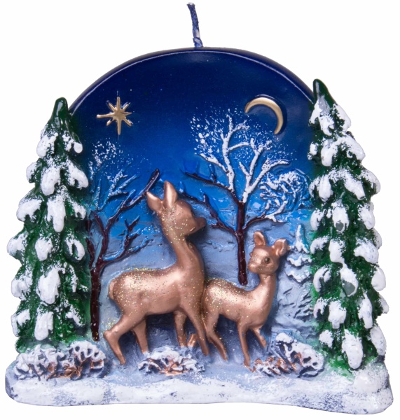 На декоративной свече изображены два олененка на фоне зимнего леса. Сувенир украшен блестками и золотой краской.