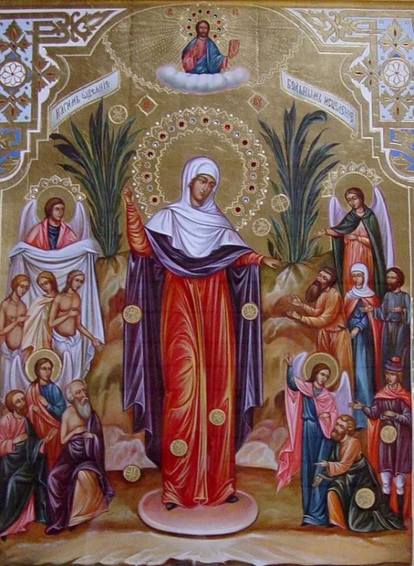 Эта икона – ростовая: Пресвятая Дева изображается на ней в полный рост, окружённой бедствующими и скорбящими людьми и ангелами, благотворящими этим людям по Её повелению. Над фигурой Пресвятой Девы изображён восседающий во облаке Господь Иисус Христос, в одной руке держащий Святое Евангелие, а другой – благословляющий предстоящих. В верхней части св. образа, по обе стороны от Пречистой, имеются начертания «нагим одеяние», «больным исцеление» и другие.