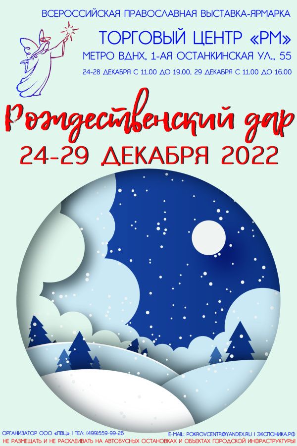 С 24 по 29 декабря приглашаем Вас посетить Всероссийскую православную выставку-ярмарку «Рождественский дар», которая будет проходить в торговом центре «РМ» (Москва, ул. 1-я Останкинская, д. 55, метро ВДНХ), где будет представлен большой ассортимент нашей продукции!