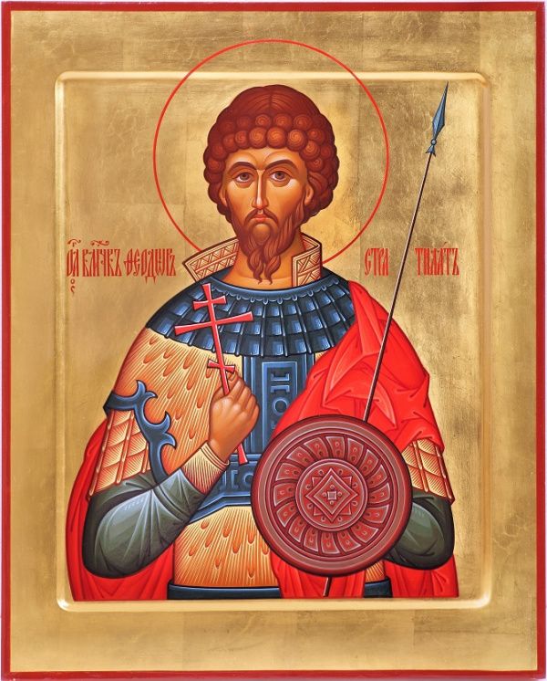 Будущий св. вмч. Феодор родился в Малой Азии, в г. Евхаите, и с молодых лет служил воином в императорской армии. Вероисповеданием его было христианство. Ещё в юности он отличался милосердием к людям и бесстрашием и однажды даже один победил змея, который укрывался в земляной трещине на поле в городских окрестностях и иногда выходил из неё и пожирал людей и скот. За этот доблестный подвиг св. воин Феодор был назначен цезарем стратилатом (военачальником) города Гераклеи. Вскоре множество язычников, проживавших в Гераклее, где св. воин служил своему Господу открытой проповедью Евангельского учения, стали обращаться в христианскую Веру и креститься. Известие об этом дошло до самого цезаря Лициния, и тот пожелал, чтобы св. Феодор предстал перед его судом. Однако св. воин сам пригласил цезаря в Гераклею, будто бы для участия в торжестве, на котором в честь его визита обещано было совершить жертвоприношение языческим богам. В ожидании прибытия Ликиния в город, св. воин Феодор каждый вечер молился в храме Спасителю, и, как повествует предание, однажды во время молитвы его осиял свет с неба, и глас свыше сказал ему такие слова: «Дерзай, Феодор. Я – с тобой!».
