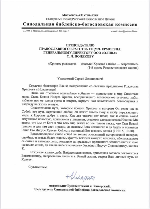 Председатель Синодальной библейско-богословской комиссии митрополит Будапештский и Венгерский Иларион поздравил Председателя Братства священномученика Ермогена, генерального директора ООО «Олива» Сергея Леонидовича Полякова со светлым праздником Рождества Христова и Новолетием. В своём поздравительном письме Его Высокопреосвященство, в частности, пожелал, чтобы «Вифлеемская звезда, приведшая волхвов поклониться Богомладенцу, непрестанно сияла и в Вашей жизни, озаряя Ваш личный путь ко Христу».