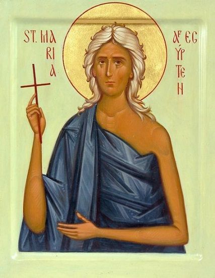 Будущая преп. Мария родилась в Египте в середине V-го века от Р.Х. Будучи двенадцатилетней отроковицей, она оставила родительский дом и поселилась в столице Византийской империи, Александрии, где около 17-и лет провела в блудодеяниях и разного рода греховных телесных услаждениях, после чего, чудесным образом призванная к покаянию Самим Господом, преподобная 37 лет провела в пустыне Иорданской, питаясь кореньями, претерпевая голод, холод и зной, первые 17 лет пребывая в жесточайшей борьбе с греховными страстями и всё это время совершенствуясь в добродетелях глубочайшего покаяния и смирения. О своей жизни преп. Мария сама рассказала одному палестинскому иеромонаху, преподобному авве Зосиме, который во время Святой четыредесятницы, за 2 года до её блаженной кончины, встретил святую отшельницу в Иорданской пустыне (жизнеописание преподобной впоследствии было включено в житие преп. Зосимы). После откровенного рассказа о своей жизни преп. Мария попросила старца Зосиму, чтобы в следующем году, в Великий четверг, он принёс из обители, где он подвизался, Святые Дары и приобщил её Святых Христовых Таин в день, когда Сам Спаситель на Тайной Вечере причастил Своих ближайших учеников, свв. Апостолов. Авва Зосима пришёл в пустыню в назначенный день и ожидал святую подвижницу на берегу реки Иордан. Наконец, он увидел, как преподобная Мария подошла к реке и, перекрестив воду, пошла по ней, как по суше. Приобщившись Святых Таин, святая отшельница попросила авву прийти к ней в пустыню и на следующий год. Св. Зосима, явившись через год на условленное место, нашёл преподобную уже бездыханной. Рядом с её честными останками на земле было начертано: «Отец Зосима! Похорони здесь тело смиренной Марии, умершей 1-го апреля». Святой старец поступил так, как было начертано, и предал честные останки преподобной земле там же, в пустыне, а вырыть могилу для погребения ему помог своими лапами дикий зверь – лев, также пришедший почтить блаженную кончину святой подвижницы. Всё это совершилось 1-го апреля, в 521 – 522гг. (по иным сведениям – в 524г.). Преп. авва Зосима вернулся после всего этого в свою монашескую обитель (в Иорданский монастырь во имя св. Пророка и Крестителя Господня Иоанна – Иоанна Предтечи) и поведал всем о великой подвижнице Духа, преп. Марии, после чего игуменом Иоанном и братией обители было решено чтить память преподобной и праздновать день её преставления. Житие преп. Марии Египетской было впоследствии составлено святителем Софронием, Патриархом Иерусалимским, который, вероятно, услышал о жизни и подвигах святой угодницы Божией от учеников преп. аввы Зосимы.