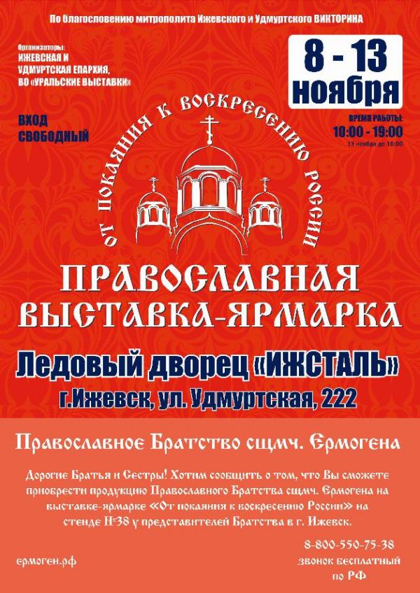 Дорогие Братья и Сестры! Хотим сообщить о том, что Вы сможете приобрести продукцию Православного Братства сщмч. Ермогена на выставке-ярмарке «От покаяния к воскресению России» на