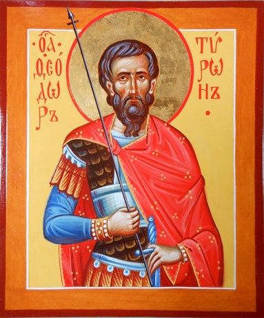 Св. вмч. Феодор Тирон, согласно преданию, был римским воином, служившим в г. Амасии Понтийской, находившейся в Малой Азии. В начале IV века нечестивым римским императором Максимианом на христиан было воздвигнуто жестокое гонение, во время которого гонители стали принуждать благочестивого воина Феодора вместе со многими другими христианами к отречению от Христа и поклонению римским языческим идолам с принесением им жертвы. Благочестивый Феодор ответил на это категорическим отказом, открыто и твёрдо исповедал имя Христово и свою веру в Спасителя. Гонители дали святому некоторое время – в надежде, что тот пересмотрит своё решение, однако всё это время святой Феодор усердно молился Господу об укреплении его духа перед предстоящими испытаниями. Видя, что святой продолжает твёрдо стоять в христианской Вере, гонители выдвинули против него ложное обвинение в поджоге одного их языческих храмов и заточили в темнице, оставив без пищи и воды, обрекая на мучительную смерть от голода и жажды. В темнице святому мученику было чудесное явление Самого Сына Божия, утешившего и укрепившего его душу. Когда святой повторно предстал перед нечестивым языческим судилищем, он вновь твёрдо исповедал истинную Веру, после чего был подвергнут жестоким мучениям с принуждениями отречься от Господа Иисуса Христа и Его учения. Однако святой со смирением переносил истязания и был непреклонен в решении пострадать за своего Господа. Видя это, гонители приговорили святого мученика к смертной казни через сожжение заживо на костре. Св. великомученик по своей воле бесстрашно поднялся на место казни, а во время казни молился своему Спасителю и славил святое Имя Христово до тех пор, пока душа его не отошла ко Господу. Мученическая кончина святого Феодора совершилась около 305 – 306 гг. н.э. Святое тело великомученика после казни осталось совершенно не повреждённым пламенем и было с честью погребено в г. Евхаиты, находившемся в окрестностях Амасии Понтийской. По прошествии времени честные мощи св. Феодора Тирона перенесли в Константинополь и положили в храме, освящённом во имя великомученика. Честная глава вмч. Феодора покоится ныне в итальянском городе Гаэте.